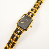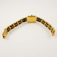 CHANEL. Bracelet montre « Première » en métal doré. Boîtier octogonal (20 x 26mm environ), cadran noir sans index, mouvement à quartz, fond clippé. Bracelet double rangs de chaîne en métal doré entrelacées de cuir noir. Signée et numérotée. Année 1987. Tour de poignet 15,5 cm environ. Taille M. Sans écrin, ni papiers. (usures, petites égrisures sur le verre)