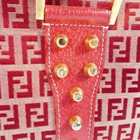 FENDI. Large sac rigide en toile monogrammée, siglée FF et cuir rouge clouté. Fermeture éclair à double curseur, poche interne zippée. Double poignées. 25 x 43 x 12cm environ. Bon état, petites taches à l’intérieur, très légère déformation en dessous.