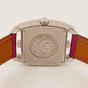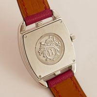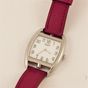 HERMES. Montre bracelet « Cap Cod Tonneau ». Ref : CT1 210, Montre de forme tonneau 26,5 x 34 mm environ (anses comprises) en acier, cadran blanc à chiffres arabes de style Art Déco. Mouvement à quartz. Bracelet en cuir fuchsia signé Hermès, boucle ardillon acier signée. Tour de poignet :16cm environ(On y joint 1 écrin rapporté qui n’est pas Hermes)