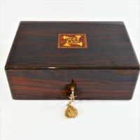 HERMES Paris. Boite en placage de palissandre, sur le haut du plateau un décor central carré avec marqueterie de ronce de noyer et décor de 4 cors de chasse en métal doré. On y joint sa clé. H.:10 cm ; L.: 28 cm; P.: 19 cm. (Rayures, petits éclats).Modèle à rapprocher de la cave à cigare réalisée par le tabletier Elie BLEU pour HERMES. Notre boîte est vide.