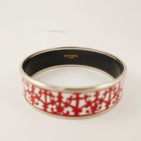 HERMES Paris made in France. Bracelet jonc 18 mm « Balcons du Guadalquivir » en métal argenté palladié émaillé dans les tons rouge et blanc. Marqué « S » pour les Soldes (Diamètre : 6,3 cm). (TBE)