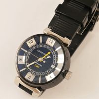 LOUIS VUITTON. Montre bracelet "Tambour In Black GMT" Ref. Q113K. Boitier rond en acier noirci, cadran noir et acier (41,5 mm), aiguilles luminescentes, guichet dateur à 3H, lecture du 2ème fuseau horaire avec l’aiguille jaune. Mouvement mécanique à remontage automatique. Bracelet en caoutchouc embossé Damier Louis Vuitton sur boucle déployante acier signée. (Rayures, et usures).