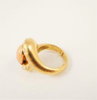 Bague mouvementée Maison MCB -MARIE-CAROLINE de BROSSES (1947-2019) en or 750 mil centrée d’un cabochon de corail en demi serti clos dans un entourage rehaussé de diamants taille brillant en serti étoilé. Monogrammée « MCB » et signée « de Brosses ». (TDD : 45). (Dimensions chaton : 1,7x1,2cm environ). 10 g. brut Avant de posséder sa propre maison de joaillerie, Marie-Caroline de BROSSES fut la dernière Directrice de la création pour la Maison René BOIVIN de 1970 à 1991, succédant ainsi à Suzanne BELPERRON et Juliette MOUTARD. Sa maison à ses initiales - MCB - fut fondée en 1993.