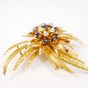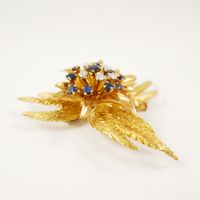 Clip de corsage en or jaune et or rose 750 mil dessinant une fleur asymétrique, à feuillage ciselé, le pistil et les étamines sertis de saphirs ronds et diamants taille brillant. Travail français des années 1950-1960. (Dimensions : 5,5 x 5,5cm environ). (Egrisures, fêles). 23,6 g. brut