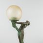 D’Après Max LE VERRIER (1891-1973) - Lampe « Clarté ». Epreuve en régule à patine vert nuancé brun figurant une jeune femme nue, la tête renversée et dressée sur ses pointes de pieds, soutenant à bout de bras une sphère en verre craquelé. Sur socle rond en marbre veiné vert. Signée sur la terrasse « Le Verrier » et cachet rond « LE VERRIER PARIS ». Hauteur totale : 38,5cm environ. (Quelques griffures et usures à la patine)