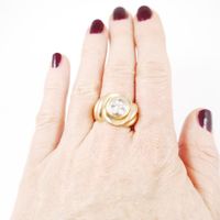 Bague en or 585 mil godronné sertie de 3 diamants TA (0,30 ct et 2 x 0,20 ct) (TDD : 54) (pierre cassée, égrisures). 14,7 g. brut.