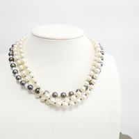 Collier de 3 rangs de perles de culture (dont 1 rang de perles de culture grises alternées de petites perles de nacre, et 2 rangs de boules de culture blanche alternées de petites boules d’hématite) (diamètres des perles : 6,8 mm ; 7,3 mm et 7,8 mm environ), avec fermoir en argent 925 mil (longueur : 42 cm environ) (fermoir défectueux, manque). 79,6 g. brut.