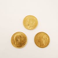 3 souverains en or 916 mil. (1874, 1908, 1930). 23,8 g.