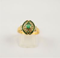 Bague en or 750 mil. centrée d’une émeraude ovale dans un entourage d’émeraudes calibrés rehaussées de diamants 8/8. (TDD : 55,5) (Pierre centrale cassée). 3,7 g. brut.