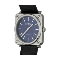BELL & ROSS Montre d’homme carrée extra large en acier. Boîtier carré, fond fermeture à vis. Cadran bleu nuit avec index bâtons, aiguilles luminescentes, trotteuse centrale et date à guichet. Mouvement mécanique à remontage automatique. Dimensions : 39 × 45,5 mm. Bracelet en cuir avec boucle ardillon en acier siglée. No BRS-92-S-13266. Sans écrin ni papiers.
