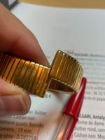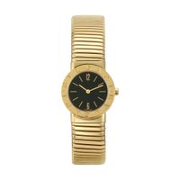 BULGARI, Tubogas. Montre de dame ronde en or jaune 750 millièmes. Boîtier rond, fond fermeture à pression. Cadran noir avec index bâtons et chiffres arabes appliqués. Mouvement quartz. Bracelet Tubogas en or 750 millièmes avec système de fermeture coulissant. Diamètre : 26 mm. Poignet : 16 cm. Poids brut : 96,1 g. Référence : BB 26 2T. No de série : P.259822. Sans écrin ni papiers. (Fermeture coulissante à réajuster).