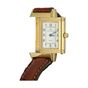 JAEGER LE COULTRE, Reverso. Montre de dame rectangulaire en or jaune 750 millièmes. Boîtier rectangulaire réversible avec fond gravé des initiales «PM». Cadran argenté deux tons avec chiffres arabes et minuterie chemin de fer au centre. Mouvement quartz. Bracelet en cuir marron avec boucle ardillon en or jaune 750 millièmes signée. Dimensions : 19 x 33 mm. Poids brut : 34,5 g. Référence : 260.1.08. No de série : 1759567. Sans écrin ni papiers.