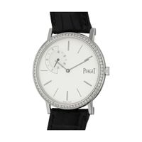 PIAGET, Altiplano. Montre d’homme ronde en or blanc 750 millièmes et diamants. Boîtier rond, fond transparent avec fermeture à vis. Lunette sertie de brillants. Cadran argenté avec index bâtons et secondes excentrées. Mouvement mécanique à remontage manuel. Bracelet en cuir avec boucle ardillon en or 750 millièmes signée. Diamètre : 40 mm. Poids brut : 67,9 g. Référence : P10706. No de série : 1105910. Écrin, surboîte, certificat daté du 16/10/2018 et un livret sur la maison Piaget.