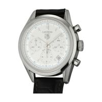 TAG HEUER, Carrera. Montre d’homme ronde en acier avec chronographe. Boîtier rond, fond vissé. Cadran argenté avec trois compteurs pour l’indication des heures, minutes et secondes, double minuterie 1/5e et 1/100e de seconde, date à guichet. Mouvement mécanique à remontage automatique. Bracelet en cuir avec fermoir déployant en acier signé. Diamètre : 38 mm. Référence : CV2110-0. No de série : GR2060. Sans écrin ni papiers.