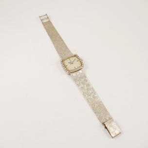 1 200 / 1 600 €Bracelet-montre de dame en or gris 750 mil, boîtier carré arrondi (Dim : 22 x 23 mm) bordé de diamants 8/8, cadran usé, argenté à index bâton, tour de bras en or gris 750 mil (Long : 16,5 cm environ), cadran et mouvement mécanique signés OMEGA (Prévoir révision). 45,6 g brut.