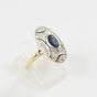 Bague en or 750 mil à chaton ovale ajouré, centrée d'un saphir ovale égrisé, rehaussé de diamants (TDD : 55). 5,4 g brut.