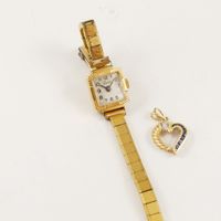 Montre de dame en or 750 mil, boîtier carré (Dim : 14 mm), cadran blanc à chiffres arabe, tour de bras en métal doré articulé, LUXE, mouvement quartz, Pendentif coeur ajouré en or 585 mil orné de saphirs et diamants 8/8. 18,3 g brut.