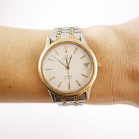 Bracelet-montre OMEGA « De Ville » en acier et métal doré, boîtier rond, cadran crème, index bâton appliqués, guichet dateur à 3H, mouvement à quartz, bracelet et boucle déployante siglée et signée en acier et métal doré, signé (diamètre : 34 mm environ) (longueur : 16 cm environ) (bracelet distendu, usures).