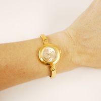 Montre-bracelet de dame GUCCI en métal doré, boîtier rond, cadran muet champagne à décor fleuri, mouvement à quartz, bracelet rigide articulé et boucle à cliquet signée en métal doré (diamètre : 26 mm environ) (longueur : 15 cm environ).