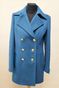 VERSACE: Manteau en Angora et soie bleu canard, col cranté, double boutonnage en métal doré à tête de méduse, manches longues, poches à revers en cuir, martingale au dos. Taille 40 italienne donc 36 française environ. Très bon état.