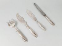 4 pièces de service de style LOUIS XVI vers 1900, les manches fourrés en argent 950 mil. comprenant :- 1 couvert à servir le poisson à cartouches et rinceaux feuillagés en médaillons. Poids brut : 260.6 g. Non chiffré. Légères déformations. - 1 pelle à poisson de la maison JOSEPH CROSSARD (actif 1900-1920) aux attributs de l’amour et filets rubanés. Non chiffrée. Rayures. - 1 couteau à découper à lauriers et canaux, la lame acier, chiffré FR. Rayures et déformations sur le manche. Minerve 1er titre de 1838. Les hauts en métal argenté. Poids brut total : 501.3 g. Repolies.