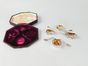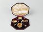 ANGLETERRE, LONDRES, 1893 : service à condiment en argent 925 mil et vermeil présenté dans son coffret d’origine du détaillant Johnson, Walker & Tolhurst Ltd au 172, New Bond Street à Londres. Il comprend 4 salerons porte-bonheur sur le thème de la ferme figurant une truie au naturel, un sabot de cheval, l’os du bréchet à souhait (dit wishbone) (enregistré N° 228292) et une fleur d’eau avec ses 4 pelles à décor de branchages, serres de volaille ou truelle. Poinçons anglais de ville, lettre date S et de maître orfèvre GH. Poids total : 228.3 g. Dim. de la truie : 3.8 x 8 cm. Ecrin accidenté.