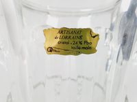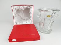 ARTISANAT de LORRAINE, XXe siècle : seau à champagne YVAN en cristal taillé en forme de vase Médicis à décor de six pans et pointes de diamant, les poignées en escargot. Signé sous la base. Etiquette. H. 26 cm. Diam. au col : 22 cm. Micro-rayures. Boite rouge de la maison.