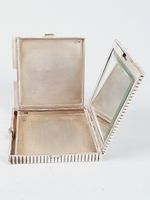 CARTIER, XXe siècle, vers 1950 : poudrier vintage en argent 950 mil. ouvrant sur son miroir biseauté et son compartiment interne à poudre fermé à décor guilloché. Modèle à cannelures et chevrons. Signé et numéroté (4859 ?). Minerve 1er titre de 1838 et tête de sanglier pour les menus ouvrages. Poinçon d’atelier PL 1 masque entre 2 étoiles pour PIERRE LEFEBVRE à Paris. Poids net : 154 g. Rayures d’usage. Léger manque au tain du miroir interne. TBE général. Poids brut total : 175.8 g. Dim. 1 x 7.5 x 7.5 cm.