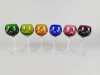 CRISTAL DE LORRAINE, XXe siècle : suite de 6 grands verres à pied en cristal Roemer de couleur jaune, vert peridot, vert emeraude, bleu cobalt, rose et améthyste, modèle à pied rond lisse, la jambe à pans et la paraison tulipe taillée de feuilles, flammèches et ronds. H. 20 cm. Non signés. Boite cartonnée de rangement d’origine « Cristal taillé en Lorraine ». Micro-rayures. TBE.