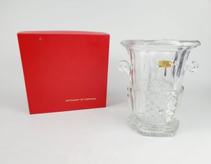 CRISTAUX d’ART, années 1950 : Service vintage en cristal taillé et métal d’un seau à glace (H. 12.9 cm) et de 39 verres comprenant 35 verres à pieds et 5 verres à fond plat dont 9 verres à eau (H. 12.2 cm), 8 verres à vin (H. 11.2 cm), 8 verres à liqueur (H. 9.6 cm), 9 coupes à champagne (H. 9.3 cm) et 5 verres à whisky (H. 9.8 cm). Modèle à base ronde lisse, la petite jambe tubulaire et la paraison gravée et taillé de croisillons et gerbes de feuilles. Les fonds plats étoilés. Sans trace de cachet. Etiquette « Cristaux d’Art » uniquement sur le seau. Micro-rayures. Petit éclat sur le buvant de 3 coupes. TBE de l'ensemble.
