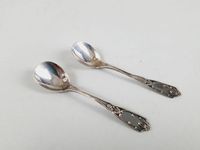 EMILE NOIRET (actif 1901-1905) : Paire de salerons en argent 950 mil. de style Louis XVI, modèle ovale à décor de cartouches, lauriers, canaux et guirlandes. Doublures en verre en TBE. Avec les 2 pelles à sel en argent 925 mil. du même orfèvre. Minerve 1er titre de 1838 et poinçon d’orfèvre. Poids net d’argent : 39.5 g. H. 3.5 cm. L. 6 cm. Déformations visible sur une tige d’une pelle. L. 6.8 cm.