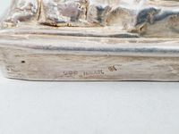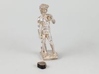 ISRAEL, FIN DU XXe siècle : Sujet en argent fondu 925 mil. figurant DAVID d'après MICHEL-ANGE, debout sur un tertre carré. Trace d’une signature sur le tertre. Poinçons israéliens. Poids brut : 427.7 g. H. 21.8 cm. Base : 6 x 6.5 cm. Rayures. Fond percé.