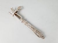 Manche à gigot tulipe de la fin du XIXe siècle en argent fourré 950 mil. à belle rocaille de rinceaux feuillagés, volutes asymétriques et vagues déchiquetées, son culot bouton. Le haut tulipe à clé trèfle en métal argenté. Monogramme FR. Minerve 1er titre de 1838. Poids brut : 159.2 g. H. 21.2 cm.