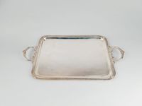 Plateau de présentation du XXe siècle en métal argenté, modèle rectangulaire à frise en bordure de petites feuilles et agrafes coquille, les 2 anses à volutes feuillagées et coquille. Sans poinçon de Maître. Dim. 42 x 31 cm. L. aux anses : 55.2 cm. Rayures. Beau modèle pour l’hôtellerie. Non chiffré.