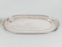 Service de platerie de 6 pièces des années 1930-1940 en métal argenté mouluré à gradins et rouleaux comprenant 1 grand plat ovale à poisson (Dim. 57 x 26.3 cm.), 2 plats ovales (dim. 43.2 x 32.2 cm et 39.5 x 27.5 cm), 1 plat rond (dim. 33 x 33.5 cm), 1 saucière à plateau amovible (dim. 8.1 x 27 x 16 cm) et 1 corbeille à pain (dim. 7 x 34.8 x 20.8 cm). Poinçon de Maître LC (main ouverte au motto RES NON VERBA). Rayures d’usage. TBE.