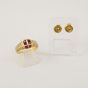 Bague en or 750 mil sertie de rubis calibrés épaulés de pavages de diamants brillantés (TDD : 52,5) (manque de matière à un rubis). Paire de clous d’oreilles en or 750 mil ornés de diamants brillantés de 0,10 ct environ chaque en serti clos (salissures). 5,8 g brut.