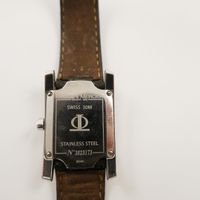 *Bracelet-montre de dame BAUME & MERCIER « Hampton » en acier, boîtier rectangulaire à pans coupés, cadran argenté guilloché à chiffres arabes et index épis appliqués, guichet dateur à 6H, mouvement à quartz, remontoir rehaussé d’un diamant taille brillant, sur bracelet en cuir noir, boucle ardillon signée. Signé et numéroté. (Dimensions boîtier : 33 x 23mm ; longueur total bracelet : 21,5 cm environ).