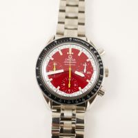 Bracelet montre d’homme OMEGA SPEEDMASTER SCHUMACHER en acier, chronographe, lunette à graduation tachymètre, boîtier rond, cadran émaillé rouge à index peints, aiguilles luminescentes, 3 compteurs secondaires, mouvement automatique, sur bracelet en acier, boucle déployante non d’origine. On y joint un bracelet en cuir usagé, avec boucle déployante en acier siglée OMEGA. (Diam. : 36 mm, tour de bras : 16 cm environ) (Série spéciale vendue entre 1996 et 1999 en hommage au pilote de Formule 1). Sans écrin ni papiers.