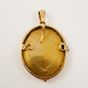 Broche-pendentif de forme ovale en or 750 mil sertie d’une miniature sur cuivre figurant une jeune femme à l’Antique en grisaille et or sur fond corail, la monture rehaussée de roses et d’émail noir, travail de la fin du XIXème siècle. (Épingle manquante, anneau et bélière rapportés et amovibles, transformations, minuscules sauts d’émail, chiffré au dos, fissures au dos) (Hauteur sans bélière : 42 mm, largeur : 37 mm). 16,1 g. brut