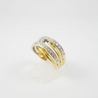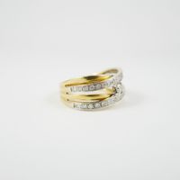 Bague bandeau ajourée 2 ors 750 mil à motifs de lignes croisées serties de diamants taille brillant, le central de 0.10 carat environ. (TDD : 58 ; Largeur : 1cm environ). 7,7 g. brut