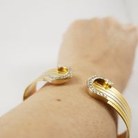 Bracelet rigide ouvert 3 ors 750 mil terminé par deux C affrontés sertis de diamants taille brillant. (Tour de poignet : 18cm ; Largeur : 1,5cm environ). (Légères déformations). 25,3 g. brut