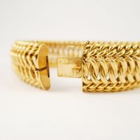 Bracelet ruban en or 750 mil à maille jugulaire bordée, fermoir à cliquet et huit de sécurité. Travail français. (Longueur : 19,5cm ; Largeur : 2cm environ). 46,6 g.
