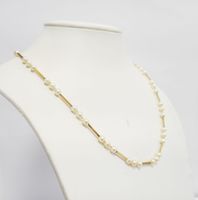 Collier d’un rang de perles de culture blanches intercalées de motifs rectangulaires en or 750 mil. Fermoir en or 750 mil. Travail français. (Longueur : 53cm ; Diamètre perles : 5mm environ). 16,4 g. brut