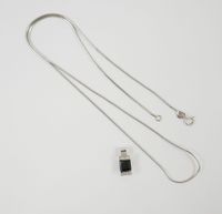 Pendentif en or gris 750 mil serti d’un saphir calibré et de diamants taille 8/8. (Hauteur : 1,4cm environ). 0,5 g. brut Collier en or gris 750 mil à maille serpent. (Longueur : 45cm environ). (Légères déformations). 3,9 g. Poids total brut : 5,4 g.