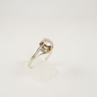 Solitaire en or gris 750 mil centré d’un diamant taille brillant de 0.70 carat environ en serti griffes. Anneau numéroté A.10907. (TDD : 57). (Serti de la pierre à revoir). 3,1 g. brut