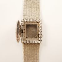 Bracelet-montre dissimulée de dame PATEK PHILIPPE en or gris 750 mil., SANS CADRAN, SANS MOUVEMENT. Boîtier rectangulaire, lunette et cache sertis de diamants brillantés (2,50 carats environ au total), bracelet et boucle à cliquet siglée et chiffrée AG (diamants brillantés) en or gris 750 mil. (dimensions : 21 x 19 mm environ) (longueur : 17 cm environ) (manque 2 vis, transformation à la boucle, usures). 67,7 g. brut
