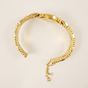 Bracelet-montre de dame GENEVE 2 ors 750 mil, boîtier rond, lunette sertie de pierres imitation incolores, cadran blanc à chiffres romains, fond clippé, mouvement à quartz, sur bracelet semi-rigide ouvert à maillons parenthèses, rehaussés de pierres imitation incolores, 2 chaînettes de sécurité, l’une sans fermoir, l’autre avec fermoir défectueux. (Diamètre boîtier : 21mm ; Tour de poignet : 18cm environ). 54,9 g. brut