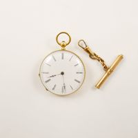 Montre de gousset en or 750 mil, carrure rainurée, cadran émaillé blanc à chiffres romains et chemin de fer pour les minutes, cuvette en or 750 mil, mouvement mécanique, dos guilloché et ciselé, blason non chiffré. Poinçon Tête de Cheval, Départements, 1838-1919. (Diamètre : 34mm). (Chocs, usures, émaillé accidenté restauré) 32 g. brut Avec sa clé en métal et or 750 mil. 5 g. brut Poids total brut : 37 g.