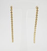 Paire de pendants d’oreilles 2 ors 750 mil ornés de diamants taille brillant en sertis clos ronds. Systèmes pour oreilles percées. (Longueur : 9cm environ). (Egrisures, petit manque à un serti au verso). 8,9 g. brut