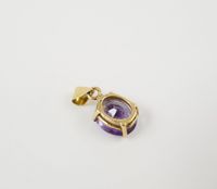 Pendentif en or 750 mil serti d’un saphir taille poire, rehaussé d’un diamant taille brillant. (Hauteur : 2cm environ). 0,9 g. brut Pendentif en or 585 mil orné d’une pierre imitation violette en serti griffes. (Hauteur : 2cm environ). 2 g. brut Poids total brut : 2,9 g.